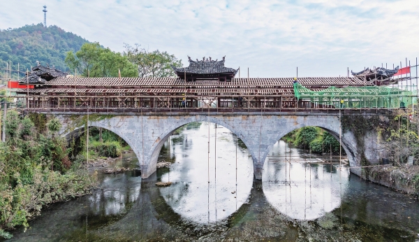 12月17日,东安县紫溪市镇花桥村,工人在对国家重点保护文物广利桥进行修缮。近年来,当地加强古建筑普查、修复和保护工作,赓续中华文明。