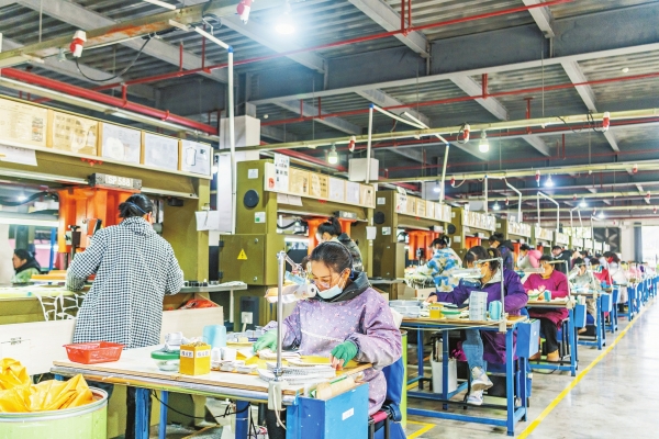 12月23日,东安县白牙市工业园凯翔鞋业生产车间,工人在加紧赶制订单产品。临近年底,白牙市工业园各企业开足马力,争分夺秒赶制订单产品,全力冲刺年底收官。