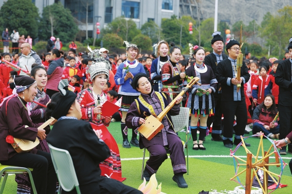 12月27日,通道侗族自治县礼雅小学,家长代表在表演非遗节目,喜迎新年。