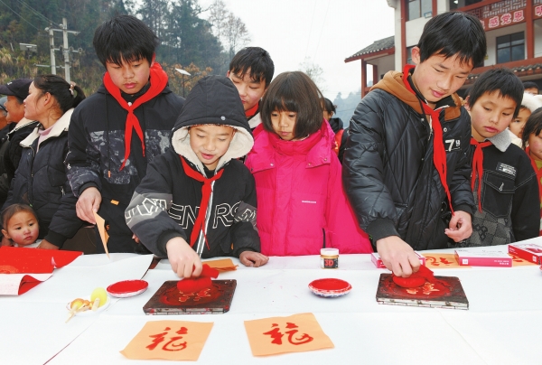 12月29日,吉首市丹青镇樟武村,小朋友在拓印“福”字。当天,该市关工委与市公共汽车公司联合举办“庆元旦迎新年”活动,志愿者与苗家孩子们一起写对联、唱苗歌、送“福”字,喜迎新年的到来。