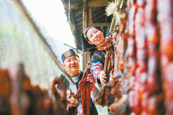 1月7日,新田县门楼下瑶族乡竹林坪村,村民在晾晒瑶山腊肉。近年来,该县利用土地富硒资源优势和瑶山独特地理环境,扩大养殖土猪、土鸡,熏制成传统瑶山腊味,吸引不少游客前来观赏体验瑶家传统习俗、购买年货。