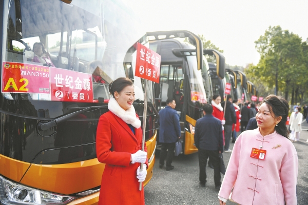 1月13日上午,省政协十三届三次会议开幕会后,工作人员微笑举牌为委员们提供指引服务。