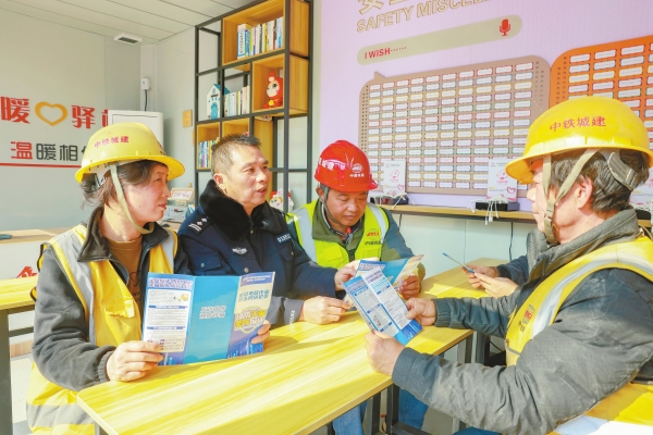 1月14日,湘江科学城首批产业配套建筑群建设项目工地,中铁城建集团联合民警开展反诈宣传教育活动。民警、项目工会指导员通过反诈宣讲、发放宣传手册、开展法律咨询等形式,围绕投资返利、刷单诈骗、冒充熟人等常见的诈骗手段,向即将返乡的工友讲解如何防范电信网络诈骗,守好“钱袋子”。
