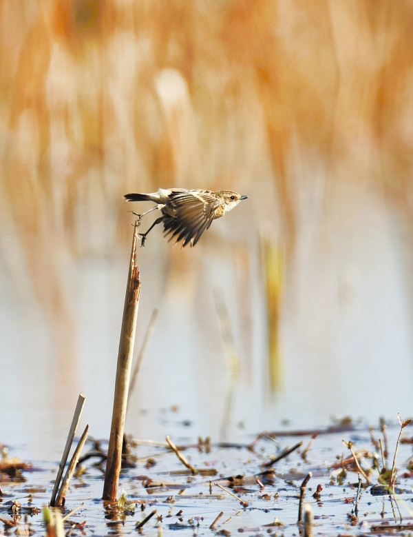 1月22日,长沙,洋湖国家湿地公园,东亚石䳭蹬秆而飞。东亚石䳭喜欢栖息于灌丛草地,主要以昆虫为食,也吃蚯蚓、蜘蛛等其他无脊椎动物以及少量植物果实和种子。