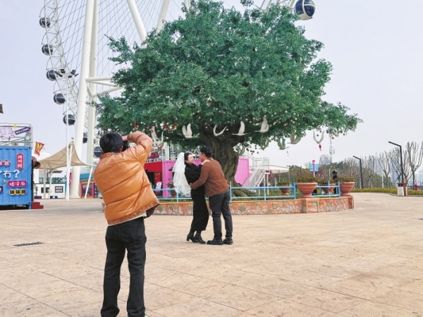 1月15日,一对刚从“雁城之星”摩天轮脚下领证的年轻人,来到专设场地拍摄婚纱照。2024年9月,有市民建议在衡阳“雁城之星”摩天轮脚下设立婚姻登记中心,雁峰区积极采纳,为新人打造浪漫打卡地。刘衡 摄