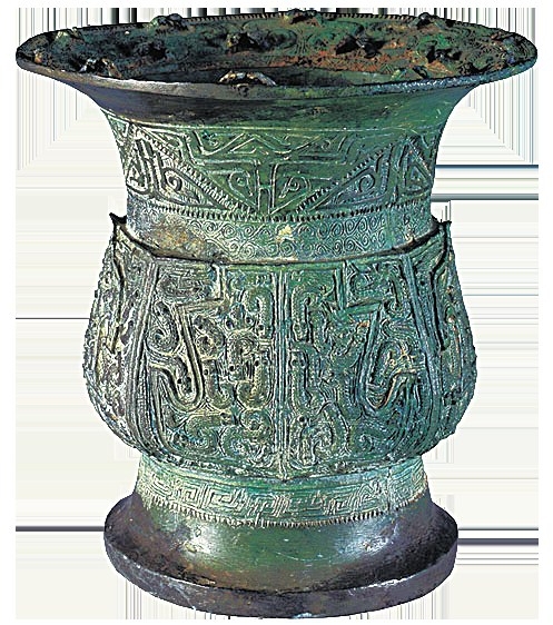 1963年出土于湖南衡山霞流,现收藏于湖南博物院的蛇纹铜尊,是湖南出土的一件具有代表性的蛇纹文物。这件春秋时期的尊,高21厘米,作为酒器,其造型古朴典雅。此种形制的尊,在中原地区常见于西周时期,而在湘江流域,却姗姗来迟,直至东周时期才现身。此尊的装饰较为特殊,颈部和圈足饰分割成三角形的几何纹,腹部饰蛇纹,每一组的边缘饰有鳄鱼纹。口沿饰一周首突起、身尾卧伏于器壁上的蛇纹,多做两头相对,其中一处三头相对,是目前仅见的一件口沿处作如此装饰的尊。
