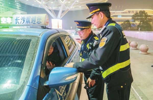 1月24日晚,高铁长沙南站,执法人员在对营运车辆进行检查。2025年春运启动以来,长沙市交通运输执法部门加大执法力度,打击扰乱交通运输市场秩序的违法行为,切实维护全市交通运输市场营运秩序。