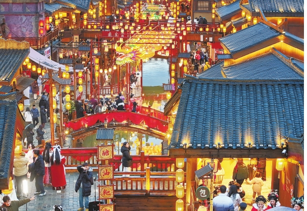1月25日,游客在衡阳市南岳区“南岳里”庙会民俗美食街区游玩。临近春节,这里每晚流光溢彩、灯火璀璨,洋溢着浓浓的年味,人们在此尽情游玩,欢欢喜喜迎接新春佳节的到来。