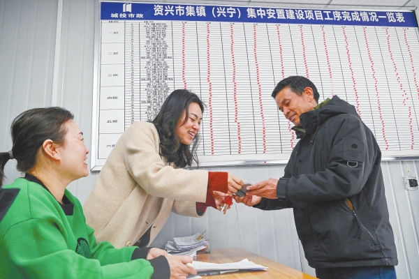 1月15日,资兴市兴宁镇、州门司集镇集中安置点首批新房钥匙发放,326套集中安置房交付给受灾群众。