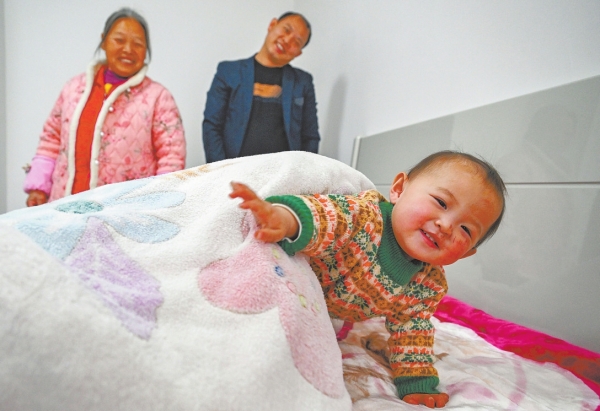 1月18日,资兴市州门司镇集中安置点福祥苑,安置户陈永霞的女儿彤彤在新家的床上玩耍。 |