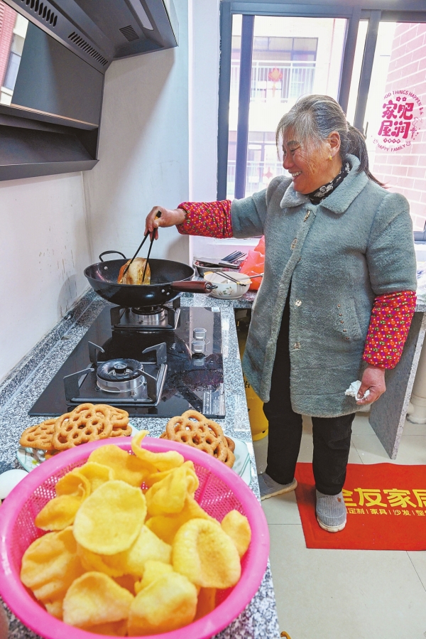 1月18日,资兴市兴宁镇集中安置点福兴苑,安置户徐晓嫦在新家做“开伙饭”,并准备了桃环、扣肉和炸虾片等过年特色美食。 |