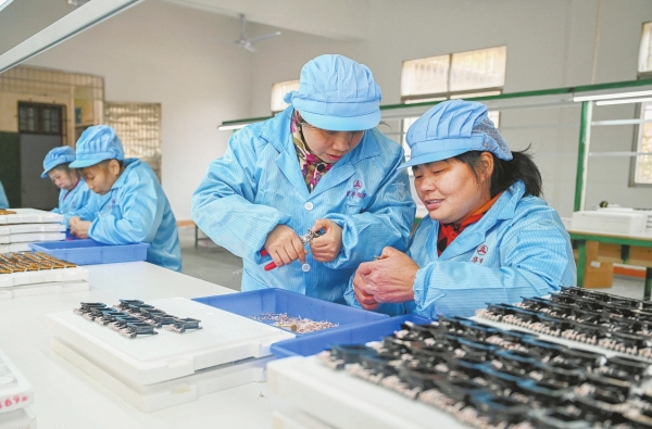 1月15日,资兴市八面山瑶族乡集中安置点瑶乡家园,安置户赵香兰(右一)在瑶乡慧华电子厂上班,学习加工小型变压器。 |