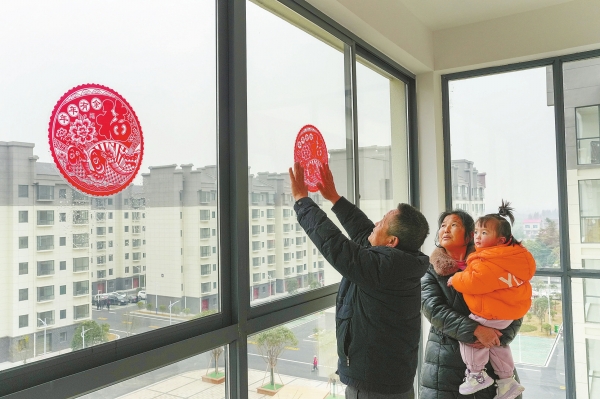 2024年12月26日,华容县团洲乡团洲新村,首批搬迁安置户宋彦锋在新家贴窗花。 |