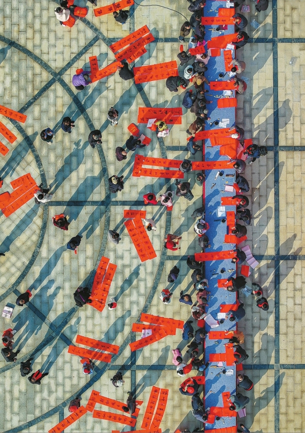 1月21日,书法爱好者为团洲新村安置群众免费写春联、送“福”字。 |