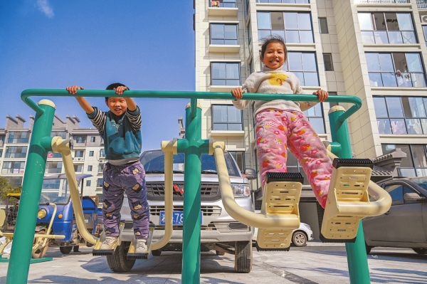 1月20日,孩子们在团洲新村休闲广场的健身器材上运动。 |