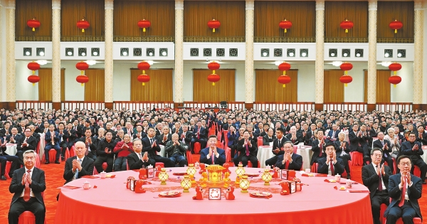 人民大会堂宴会厅灯光璀璨、暖意融融,各界人士2000多人欢聚一堂、共迎佳节,现场洋溢着欢乐祥和的节日气氛。
