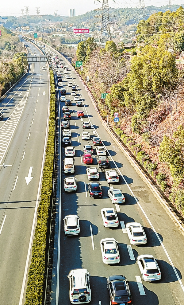 1月27日,长潭西高速学士收费站,出城车辆排起长队缓慢前行。
