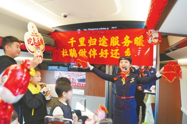 1月27日,乘务员在G1348次列车上为旅客表演节目,送上节日祝福。