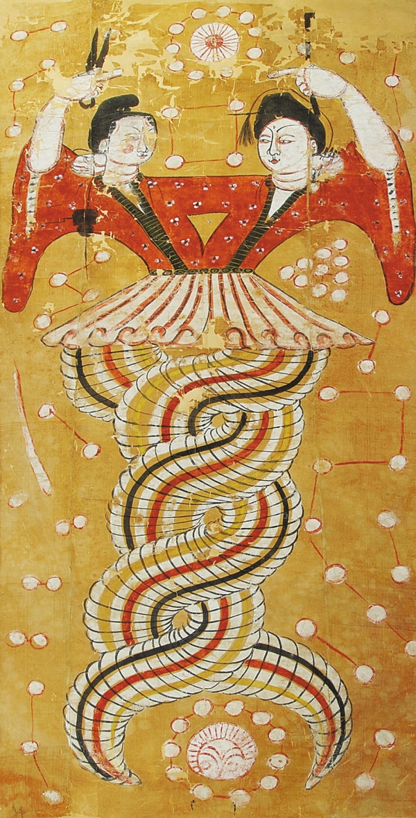 1953年,欧洲科学家发现了DNA的双螺旋线结构。人们蓦然发现,伏羲女娲图中蛇身互相缠绕的形象,竟然与其相似,而伏羲女娲恰恰又是代表着人类的繁衍与生命的延续,这或许是一个神奇的巧合,让伏羲女娲图又增添了几分神秘色彩。伏羲女娲图迄今依然有着众多难以定论的解读。即使是对墓室摆放伏羲女娲图这一葬俗的含义,中外学者们也有不同的看法。