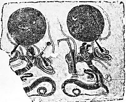 在墓葬中雕凿、绘制伏羲女娲人首蛇身,蛇尾缠绕的图案,流行于西汉时期,这也就是说,虽然关于伏羲女娲兄妹交合的文字资料出现得很晚,但其图案至少早于文字千年左右便已经在民间存在,成为当时的一种葬俗。