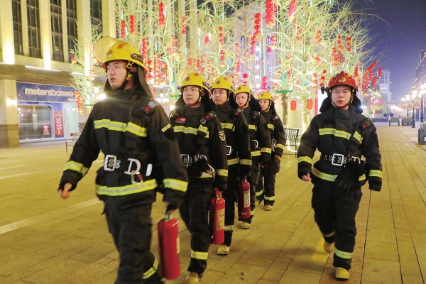 1月28日晚,消防员手提灭火器在常德步行街巡逻。当晚,常德市消防救援支队在全市成立25个巡逻小分队,对全市重点场所进行现场值守、流动巡查,确保除夕之夜的消防安全。