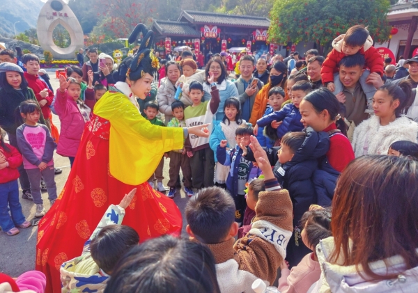 1月30日,资兴市东江湖旅游区游客中心广场,演员和游客互动。春节假期,该旅游区推出了丰富多彩的文化活动,让游客在尽情游览山水画卷的同时体验民俗文化,乐享春节假期。徐金平 摄(湖南图片库)