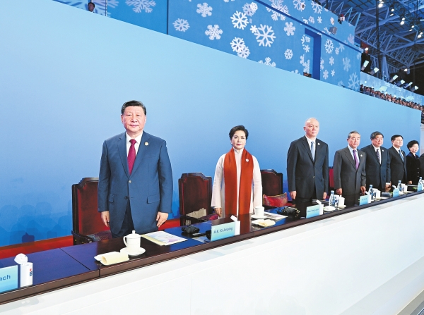 19时58分,在《和平——命运共同体》的乐曲声中,习近平和夫人彭丽媛,同国际奥委会主席巴赫、亚奥理事会第一副主席霍震霆等步入主席台,向观众挥手致意。全场响起长时间的热烈掌声。