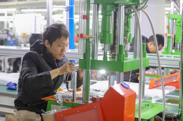 2月7日,衡阳县西渡高新区泰科汉泽精密电子有限公司,工人在生产车间赶制订单产品。春节假期过后,该高新区内的企业开足马力赶订单,生产车间一派繁忙景象。刘欣荣 摄(湖南图片库)
