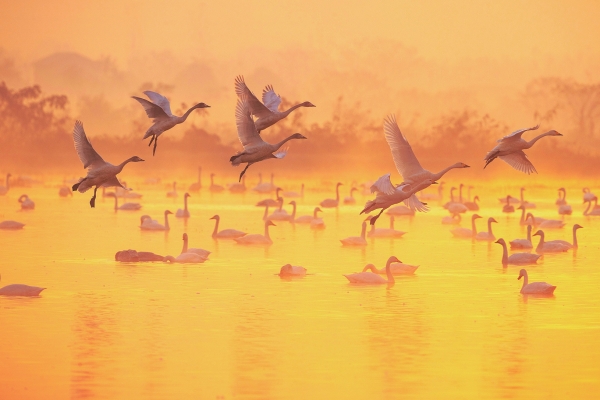 1月20日,岳阳市屈原管理区,薄雾像轻柔的纱在东古湖漂浮着,国家二级保护动物小天鹅水中游弋,空中起舞,宛如童话世界。 |