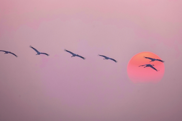 1月8日,临湘市黄盖湖,国家一级保护动物白鹤穿日而过。白鹤全球数量6000多只,繁殖于西伯利亚,长江中游是其最重要的越冬地。 |