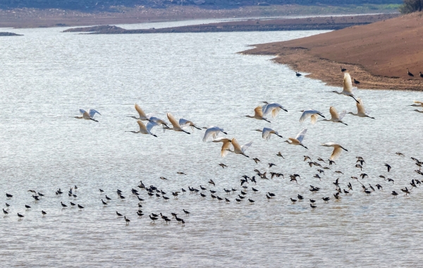 1月25日,岳阳县麻塘垸,国家二级保护动物白琵鹭从一群鹤鹬上方翩然飞过。 |
