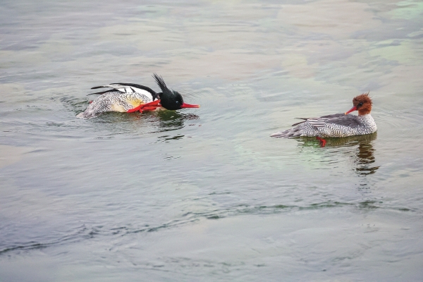 2月8日,桃源水电站大坝下方浅滩水域,国家一级保护动物中华秋沙鸭在梳理羽毛。 |