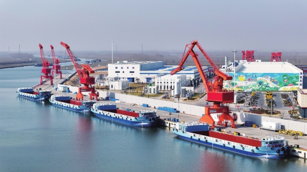 图为2月16日,在济宁能源集团山东新能船业有限公司,新能源船舶在进行舾装作业(无人机照片)。