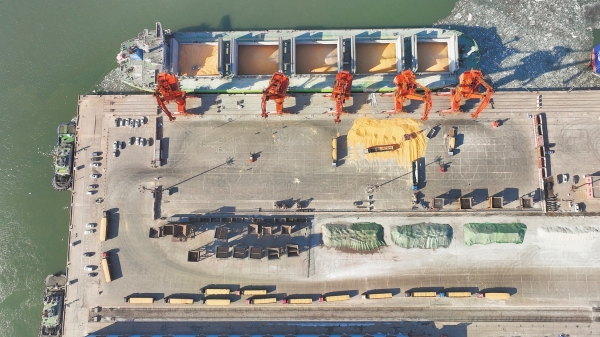 2月18日,在“北粮南运”的枢纽港——辽东半岛中部的营口港,门机将玉米吊装到散粮运输船舶上(无人机照片)。连日来,这里车船如织,一场大规模的粮食“迁徙”正值高峰。