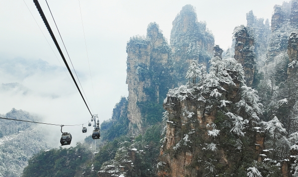 2月22日,天子山索道在冰雪云雾中穿行。受冷空气影响,张家界国家森林公园高海拔地区再迎降雪,天子山景区峰林间银装素裹,景美如画。