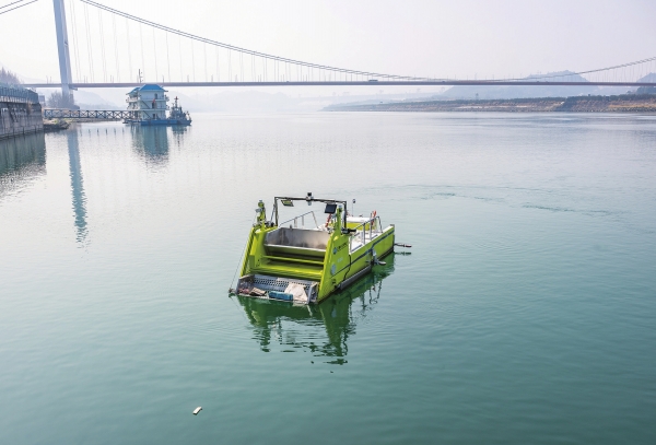 2月25日,智能清洁机器人在三峡大坝坝前水域收集水上漂浮物。近年来,三峡集团长江电力三峡电厂先后开发检测维护机器人、设备巡检机器人、水域作业机器人、智慧仓储机器人等多种类型的“机器人编队”,提升运维效率和安全水平,为大国重器安全运行保驾护航。