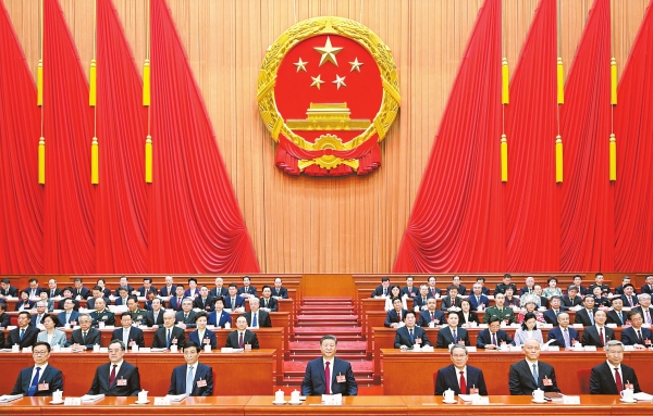 人民大会堂大礼堂气氛庄重热烈,主席台帷幕正中的国徽与会场穹顶上的五角星灯交相辉映。