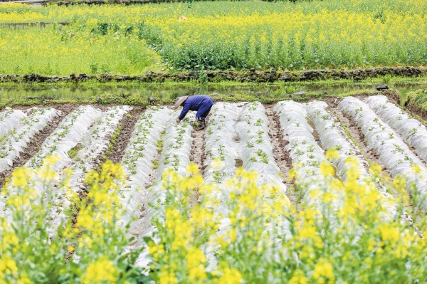 3月5日,吉首市乾州街道关侯村,村民在田间劳作。惊蛰节气,该市各地农民抢抓农时,进行春季田间管理,田间地头一派农忙景象。