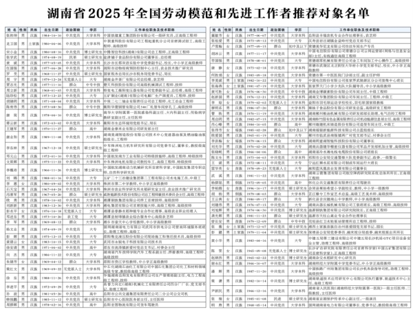 根据《中共中央办公厅 国务院办公厅关于做好全国劳动模范和先进工作者推荐评选工作的通知》和《2025年湖南省全国劳动模范和先进工作者推荐评选工作方案》精神,为贯彻公开、公平、公正原则,广泛听取群众意见,现将湖南省2025年全国劳动模范和先进工作者推荐对象名单进行公示,公示时间为2025年3月6日至3月12日。公示期间,如对推荐对象有异议,请以电话、信函等形式反映(信函以到达日邮戳时间为准)。反映情况须客观真实,以单位名义反映情况的材料需加盖公章,以个人名义反映情况的材料应署实名,并提供有效联系方式。