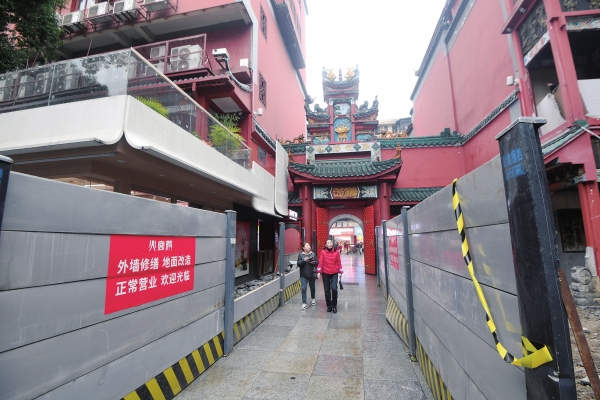 3月12日,长沙市坡子街火宫殿总店,游客顺着围挡,进店参观或消费。火宫殿作为长沙极具代表性的文化名片,拥有448年悠久历史,目前正在进行改造工程。此次改造总工期预计将持续2年左右,近期启动的是第一阶段,将修缮外墙、改造地面,工期约2个月。