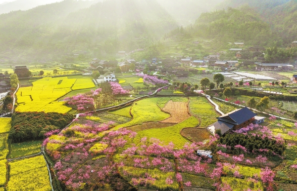 3月27日,新化县奉家镇下团村,桃花、梨花、油菜花竞相盛放,与民居相映成景,构成一幅春意盎然的田园画卷,美不胜收。