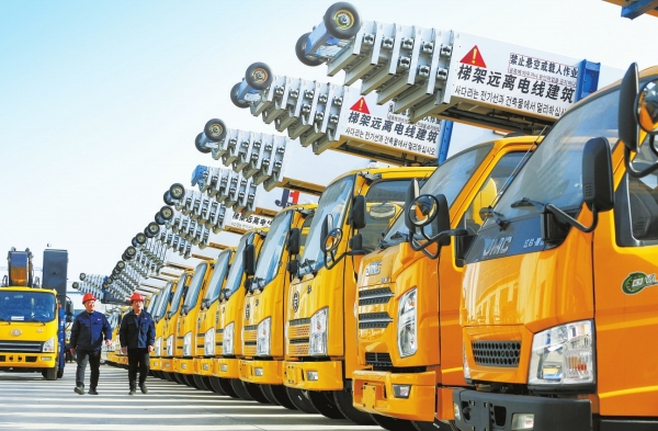 一季度末,各地企业加紧生产兑现订单,冲刺“开门红”。图为3月30日,在位于山东省青岛市即墨区金口镇的青岛九合重工机械有限公司,员工盘点待出厂的云梯车。