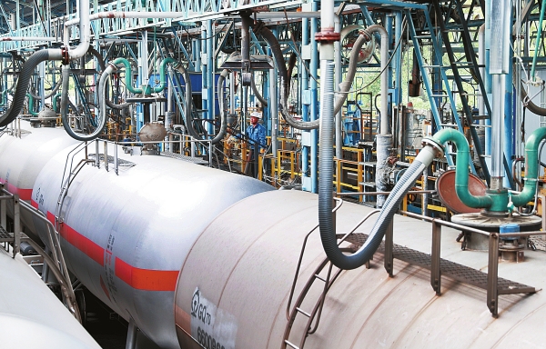 3月27日,中石化湖南石化清洁油品铁路装车站台,当班员工忙着做好汽油、柴油及航空煤油装车封罐工作,确保油品专列准时出厂。当前,中石化湖南石化公司炼油装置进入周期运行末期,公司狠抓装置平稳运行、优质生产,汽油、柴油及航煤日产量近1.38万吨,出厂质量合格率100%。