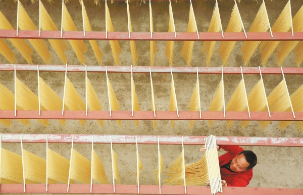 4月1日,龙山县召市镇双进社区,村民在忙着晾晒面条,供应市场。近年来,该县积极引导乡村能人创办面条、粉条等作坊,拓宽当地群众增收渠道。