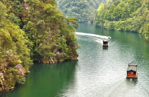 4月4日,游客在宝峰湖景区乘船游览。当天,张家界国家森林公园、宝峰湖等景区迎来春季旅游小高峰。