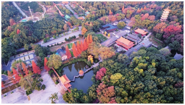 能被夹山寺的“绿色”所包围、所治愈,更是一件幸事。自山门而入,兰清池上九曲桥,九曲桥下春波绿,桥上建有六角重檐的兰清亭,倚亭赏景,池水,如同碧玉。寺内还有钟鼓二楼、天王殿、大雄宝殿、大悲殿、灵泉舍利塔、祖庭禅茶院等场所,皆隐于“绿色”,与参天蔽日的香樟、柏树等相得益彰。“气熏芬馥花经眼,影射扶疏竹映怀”,这样的“绿色”,如同桃源秘境,置身其间,顿觉万物可爱。