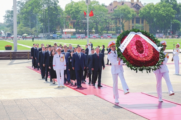 4月15日上午,在越共中央总书记苏林陪同下,中共中央总书记、国家主席习近平瞻仰胡志明陵并敬献花圈。