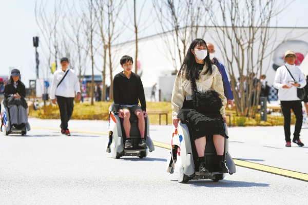2025年大阪·关西世博会(大阪世博会)4月13日正式开园以来,吸引大量游客。图为14日,游客在日本大阪世博会园区体验电动交通工具。