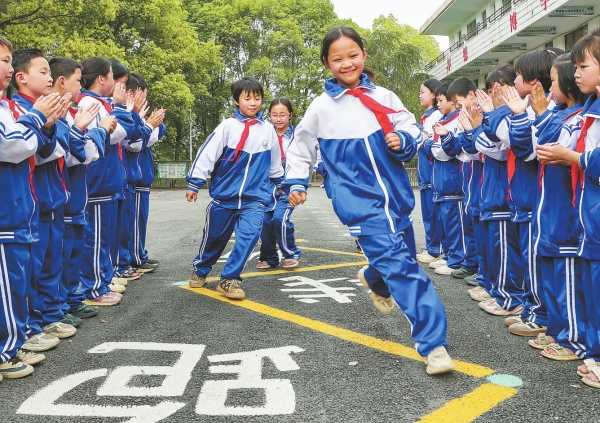 4月16日,地处偏远乡村的新田县洞心中心小学,身着新校服的学生在大课间进行折转跑游戏。当天,该校220名学生领到了由新田县教育基金会捐赠的爱心校服。近年来,该县积极动员社会力量捐资助学,促进乡村义务教育发展。
