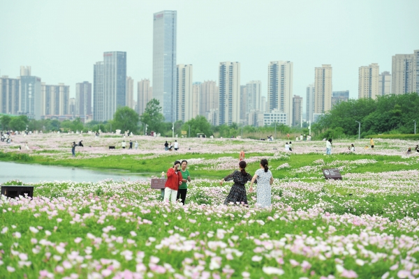 4月21日,长沙洋湖国家湿地公园,游客在月见草花丛中赏花拍照。该公园栽种的月见草正值盛花期,粉色小花汇成花海,绵延数百米,给公园增添了一份梦境般的浪漫,吸引众多游客前来游玩。